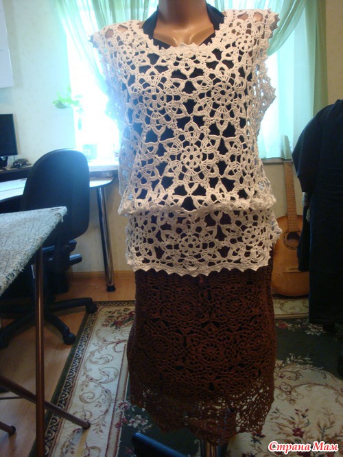 Добрый вечер дорогие рукодельницы!!! Связала юбочку себе на лето мотивами. Может быть банально, но мне нравится. На одном фото нарядила манекен в наряд с предыдущей вязалкой, топик мотивами. Даже вчера, на дне рождения своей доченьки, была в обновке. Спасибо всем за отзывы и коменты.