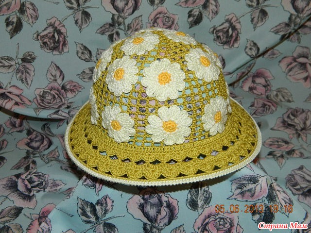 Я вязала из пряжи Бегония(169м\50 гр), в одну нитку. На всю шляпку и ромашки ушло чуть больше одного моточка на размер 42-43 см.