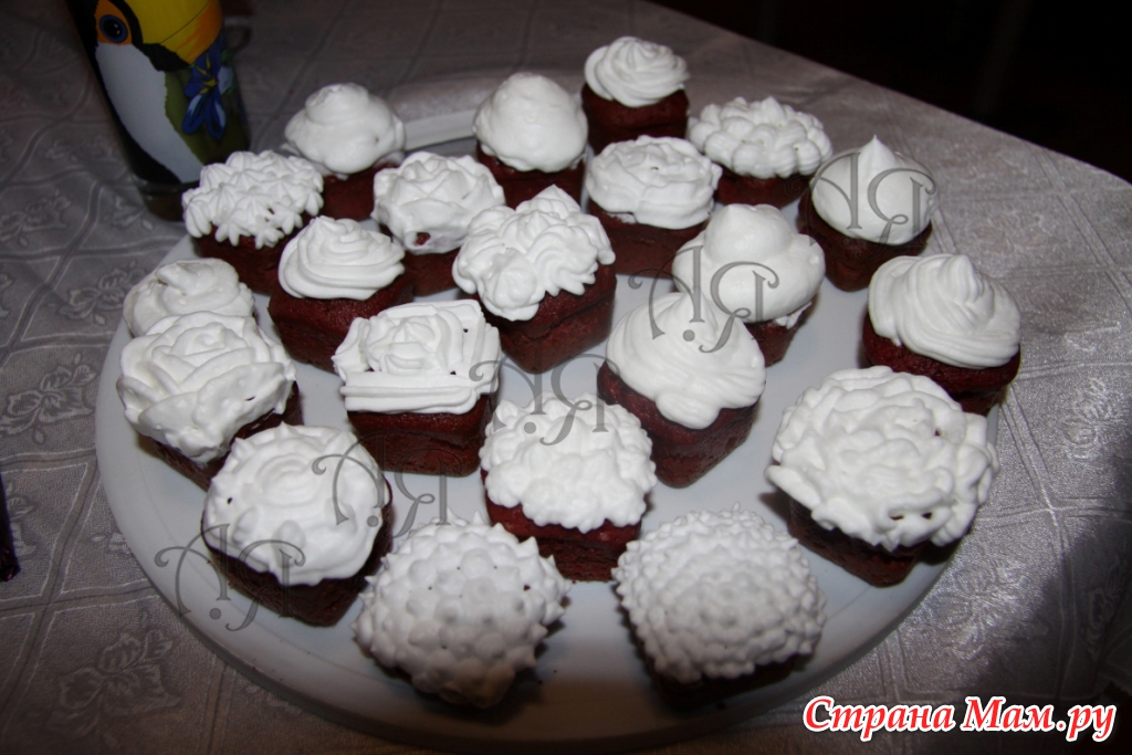 Везде Красный бархат. В тортиках маскарпоне со взбитыми сливками. В капкейках Взбитые сливки.