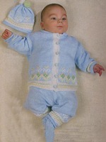 На спицы № 2,5 нитью синего цвета набрать 46 п. Вязать 4 см лиц. гладью, затем резинкой 1 лиц. скрещ. п. х 1 изн. п. 4 р. нитью белого, по 2 р. нитью желтого, белого и зеленого и 4 р. нитью белого цветов. Далее вязать лиц. гладью 1 р. нитью синего цвета - в этом р. равномерно прибавить 20 п., выполнить белую часть узора 1 и вязать нитью синего цвета до окончания. Для скосов прибавить от высоты 8 см с обеих сторон в каждом 3-м р. 17 раз по 1 п. На высоте 20 см закрыть с обеих сторон в каждом 2-м р. 4 п., 3 п., 2 п., 1 п. На высоте 45 см вязать 2,5 см резинкой 1 лиц. скрещ. п. х 1 изн. п., 1 р. изн. гладью, 2,5 см резинкой 1 лиц. скрещ. п. х 1 изн. п. и закрыть п. Над выполненным узором нитью желтого цвета вышить короткими стежками через 2 п. верхнюю часть узора 1. Вторую штанину вязать таким же способом. Выполнить швы, верхние 2,5 см загнуть внутрь по изн. р. и пришить, первые 4 см на резинках сшить по лиц. стороне, до этой высоты загнуть штанины в трубочки. В кулиску продеть эластичную тесьму.