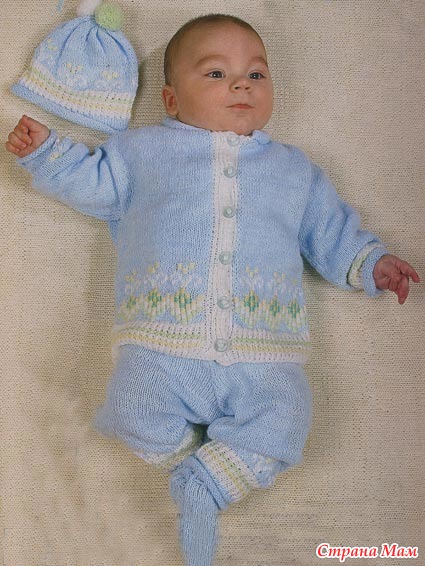 На спицы № 2,5 нитью синего цвета набрать 46 п. Вязать 4 см лиц. гладью, затем резинкой 1 лиц. скрещ. п. х 1 изн. п. 4 р. нитью белого, по 2 р. нитью желтого, белого и зеленого и 4 р. нитью белого цветов. Далее вязать лиц. гладью 1 р. нитью синего цвета - в этом р. равномерно прибавить 20 п., выполнить белую часть узора 1 и вязать нитью синего цвета до окончания. Для скосов прибавить от высоты 8 см с обеих сторон в каждом 3-м р. 17 раз по 1 п. На высоте 20 см закрыть с обеих сторон в каждом 2-м р. 4 п., 3 п., 2 п., 1 п. На высоте 45 см вязать 2,5 см резинкой 1 лиц. скрещ. п. х 1 изн. п., 1 р. изн. гладью, 2,5 см резинкой 1 лиц. скрещ. п. х 1 изн. п. и закрыть п. Над выполненным узором нитью желтого цвета вышить короткими стежками через 2 п. верхнюю часть узора 1. Вторую штанину вязать таким же способом. Выполнить швы, верхние 2,5 см загнуть внутрь по изн. р. и пришить, первые 4 см на резинках сшить по лиц. стороне, до этой высоты загнуть штанины в трубочки. В кулиску продеть эластичную тесьму.