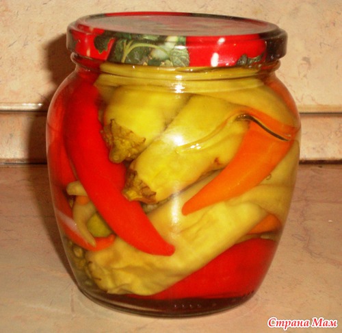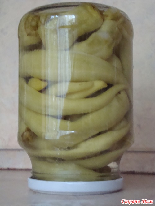 Уложить плотно подготовленный перец в банку, положить соль, сахар, уксус и залить кипятком. Поставить стерилизовать на 15-20 мин. При стерилизации перец поменял цвет с зеленого на желтоватый. Закатать крышкой и укутать в тепло.