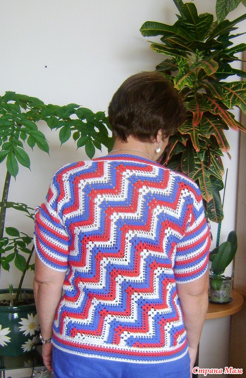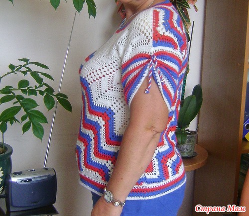 Когда-то в юности была у меня кофточка в сине-бело-красную полоску, которую я очень любила. В хомячьи запасы были закуплены нитки бэби-вул; и благополучно ждали своего часа. И вот он настал: родилась идея использовать понравившуюся модель японского топика, связанного от угла.