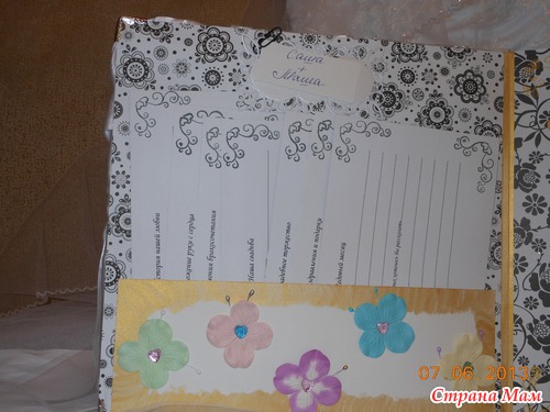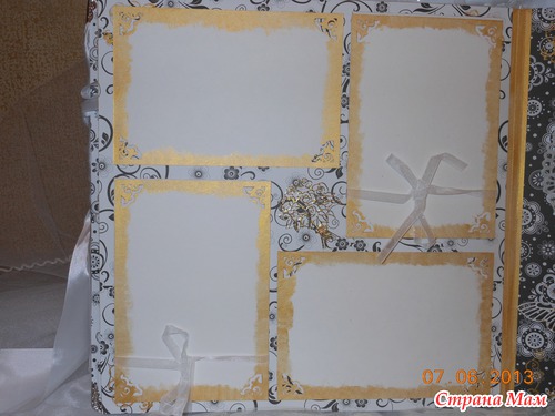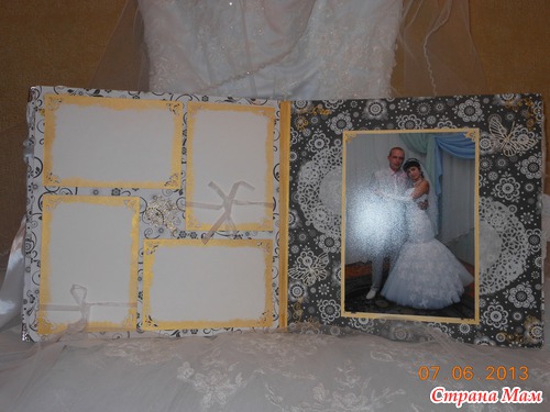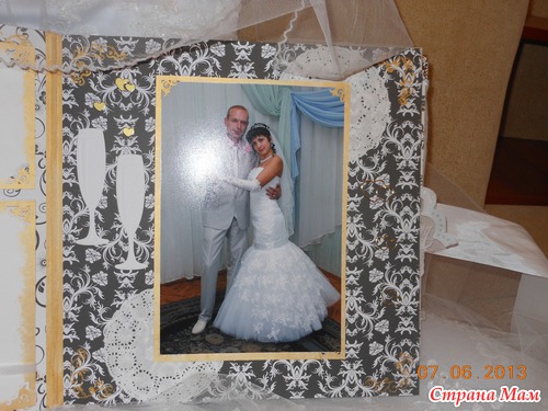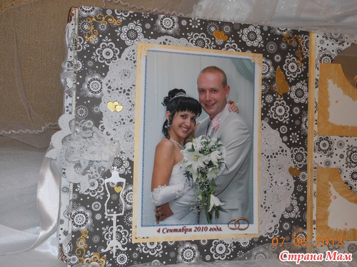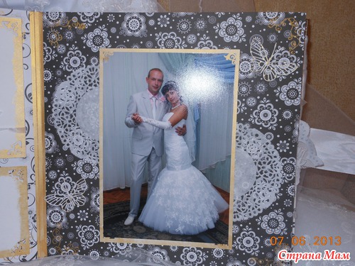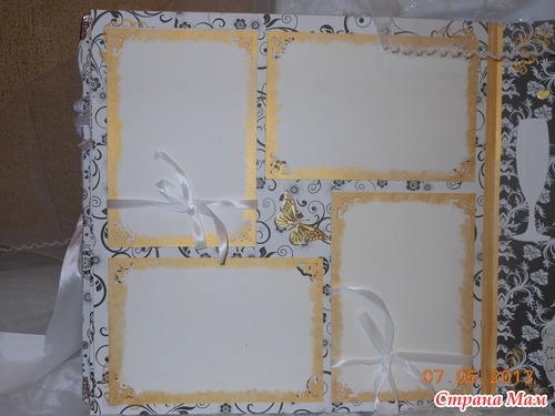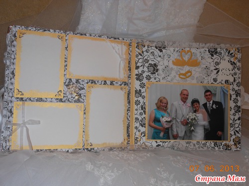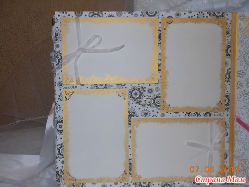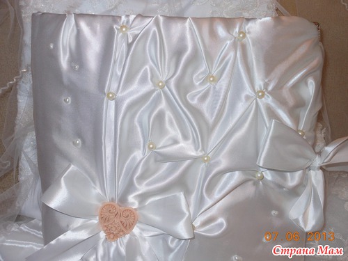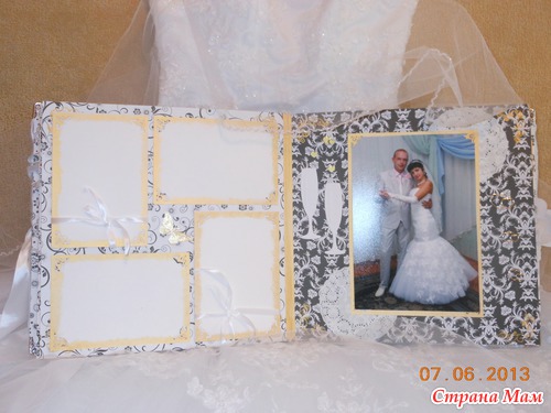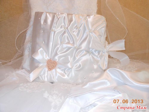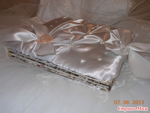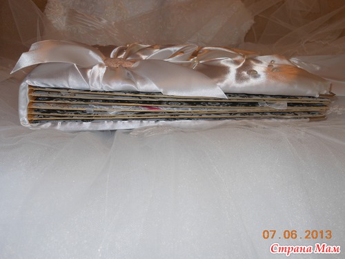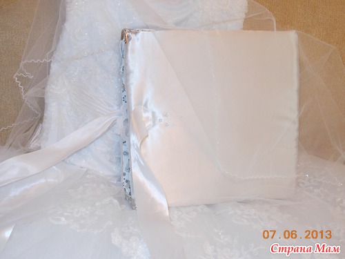 Всем приветик... Представляю вам мою новую работу. Свадебный альбом, рассчитан на 47 фотографий и 4 диска(под фото и видео файлы). 7 фотографий 22,5 на 14 и 40 фото 10 на 15. Обложка мягкая (синтепон обтянутый белым атласом), украшенная с обеих сторон стразами "сердечками" и бусинами. Завязывается на атласные ленты. На оборотной стороне обложки находиться карман с тегами (История нашей любви, Предложение руки и сердца, Церемония бракосочетания, Наша свадьба, Свадебное торжество, Подарки и поздравления, Медовый месяц) Над карманом располагается ажурный тег для написания имён новобрачных. Спасибо за внимание... смотрим...