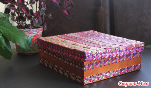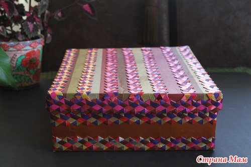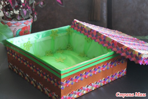 Взяла новую картонную коробочку из под обуви обклеила цветной бумагой и декоративной лентой(сделала сама)