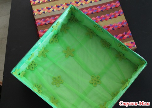 Внутри обклеила капроновой тканью с добавлением декоративных тканевых цветочков (декоративные цветочки были куплены давно, завалялись), клеила " пистолетом".