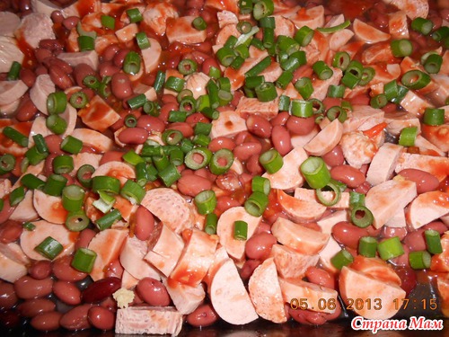 В форму для запекания выкладываем фасоль(я в магазинах наших не нашла в томате. брала в собственном соку и добавляла кетчуп), режем сосиски. Перемешиваем, я ещё посыпала зелёным луком