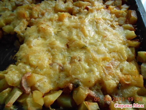 Когда картофель зарумянится вытаскиваем, посыпаем тёртым сыром и ещё раз в духовку пока сыр не расплавится.
