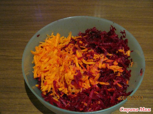 Свеклу и морковь трем на крупной терке (впрочем, можно и на мелкой)