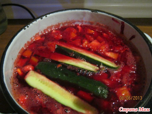 Лучше не спрашивайте меня, каким должно быть соотношение воды и овощной массы, т. к. это строго на любителя. Я лично люблю, чтобы ложка стояла (это не фигуральное выражение):
