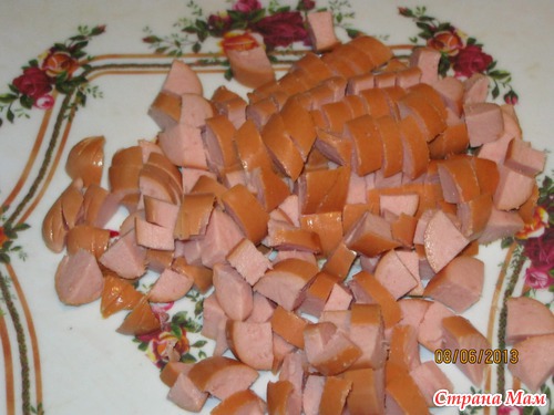 Конечно, вместо сосисок здоровее было бы использовать отварную куриную грудку, а вместо приправы - свежую зелень, но мне лень было идти в магазин