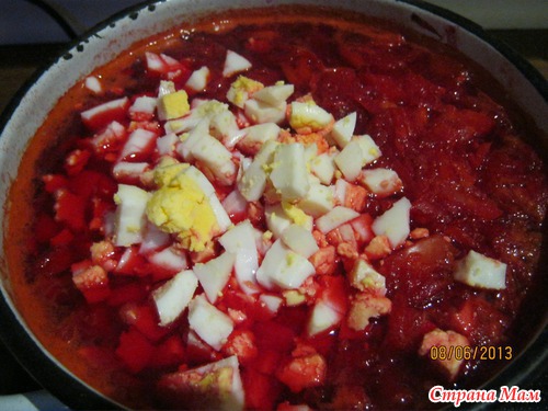 Потом режем яйца, но их добавляем, когда процесс кипения уже начался.