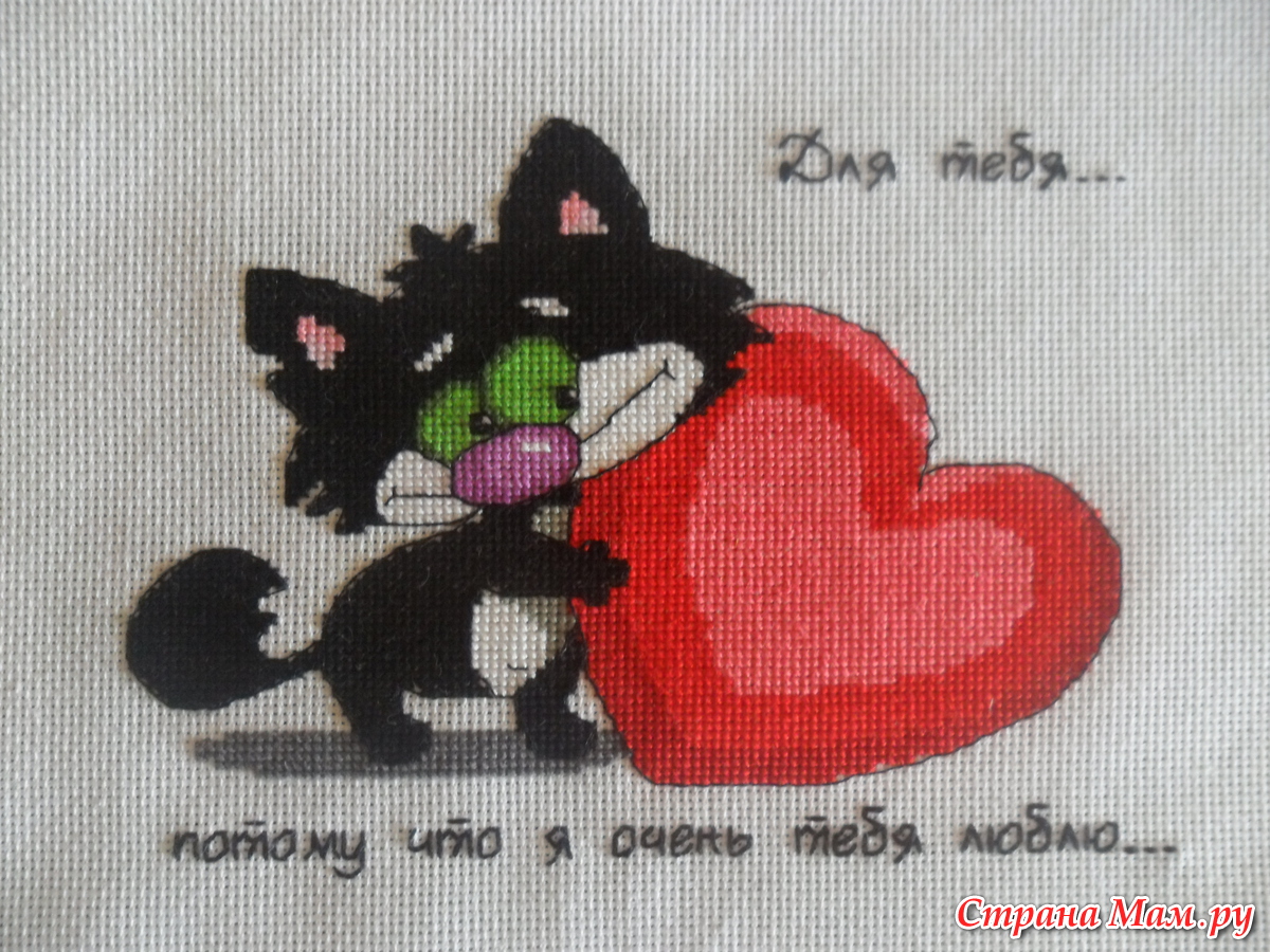 Вышивание шло легко и гладко. Правда, в некоторый момент меня смутил сиреневый носик у котенка. Перезвонила заказчице с предложением поменять цвет, но она решила оставить его таковым. А вот с "бэком", конечно, я поигралась... Его достаточно много. И самое неприятное, что бОльшая его часть была "черным по черному". Но я героически его одолела и вот таков результат.