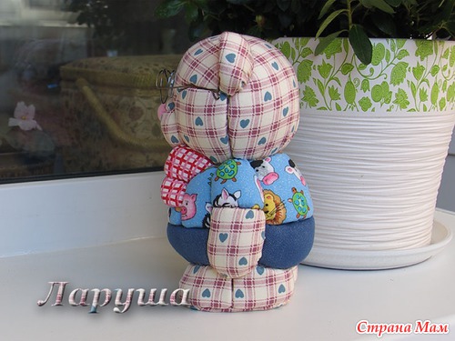 Суть проста - на пенопласте делаются надрезы, берем лоскутки ткани и натягиваем, заправляя края в надрезы. Клей не используется (Мишке я только глазки приклеила). Результат перед вами