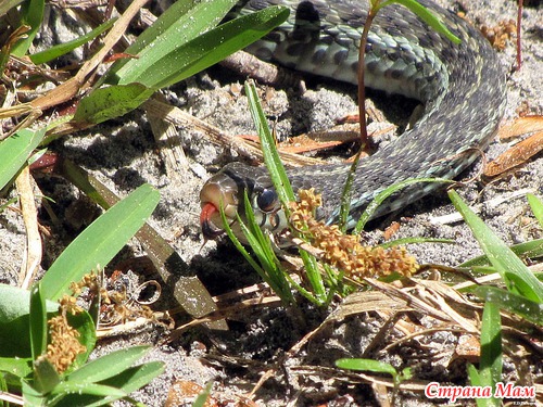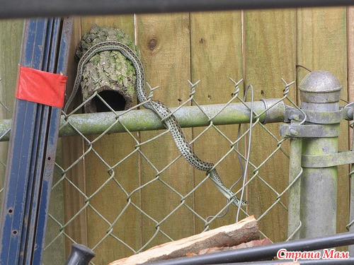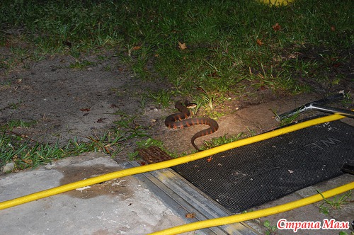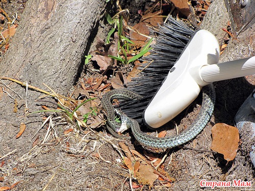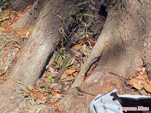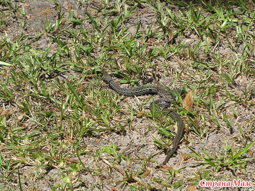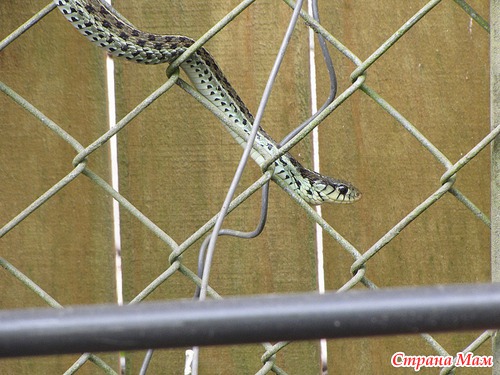 Как я вскочила со скамейки - не помню. Аж подушечку прихватила чтоб отмахиваться. Есть у нас такие змеи что прыгают в высоту не хуже обезьян. Оказалась не так всё и страшно. Но за фотиком я сбегала. Смотрим: