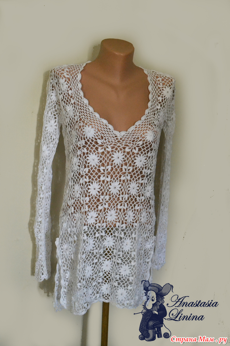 Заказали мне всем известную тунику! Первый ряд вязала отдельными мотивами, потом попробовала безотрывное вязание и пошло поехало