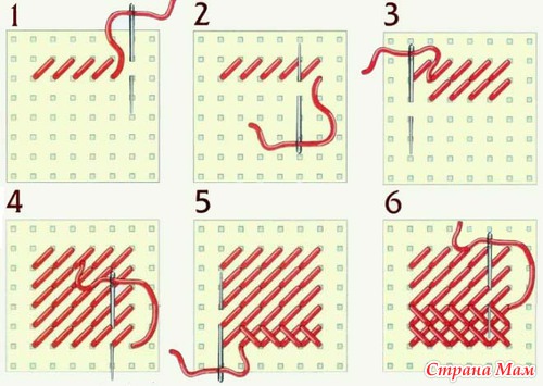 теперь как первый полукресты прошиты, в обратном направлении снизу вверх с права налево перекрываем наши крестики