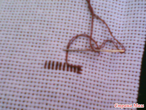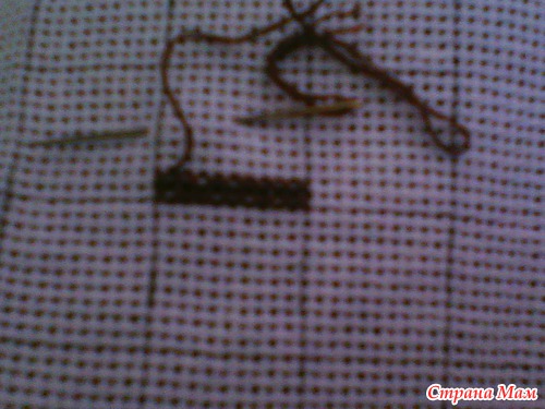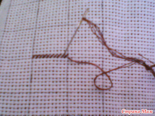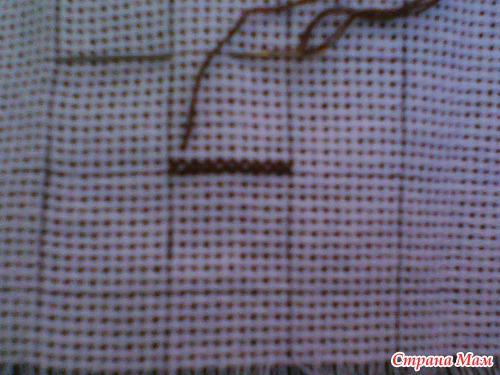 с изнаночной стороны продеваем иголку в клеточку внизу размеченного квадратика