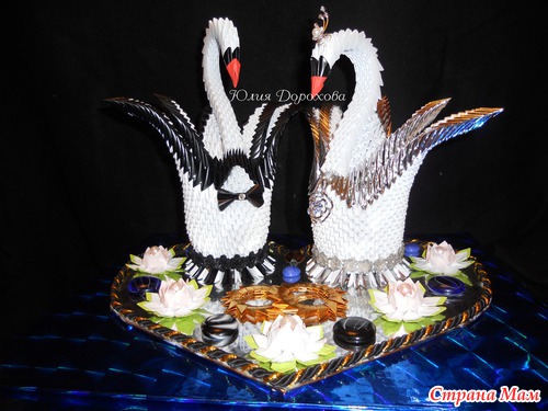 Лебеди выполнены в технике модульного оригами. Черный, серебряный и золотой модули сделаны из самоклеящейся пленки, остальное из простой бумаги для принтера. Сердце вырезано из фанеры, обклеено самоклеящейся пленкой. По контуру приклеен шнур, камни купила в цветочном магазине.