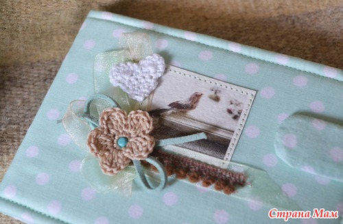 Украшен распечаткой, кружевом, кожаным шнуром, лентой, брадсами и вязаными элементами.