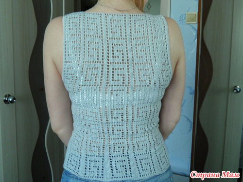 Только вчера смотрела тунику этим узором, ее в он-лайне тут вязали. А тут ваша маечка. Вы отдельно вязали полоски нужной длины и сшивали, или вязали одним полотном?