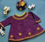 КОКЕТКА. Открытые петли переснимите на круговые спицы следующим образом: 25 п. левой половинки спинки, 25 п. рукава, 51 п. переда, 25 п. рукава, 25 п. правой половинки спинки. Свяжите 10 рядов платочной вязкой, чередуя через каждые 2 ряда сиреневую и желтую пряжу, затем свяжите 8 рядов сиреневой пряжей лицевой гладью, равномерно убавляя в каждом 4-м ряду по 16 п. Провязав 18 рядов кокетки, желтой пряжей свяжите 10 рядов лицевой гладью и закройте все петли, не стягивая край.