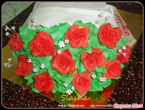 Торт "Букет роз" Внутри ванильный шифоновый бисквит, крем-брюле, бананы, киви. Вес 3,4 кг Мастика ММ, под мастику раст. сливки.