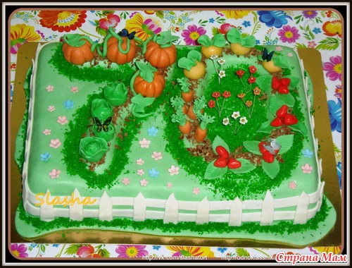 Торт "Огород". Вес 4,6 кг. Внутри "Монастырская изба" со сметанным кремом. Мастика ММ, полуганаш.