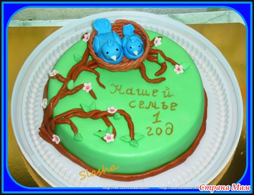 Торт на первую годовщину свадьбы "Семейное гнёздышко". Внутри медовик "Пчелка". Вес 1,8 кг. Мастика ММ, полуганаш.