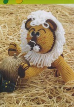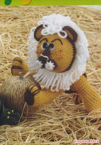 Затем для гривы свяжите белой пряжей 4 ряда, чередуя 1 ряд ст. без накида и 1 ряд ст. с вытянутыми петлями. Затем вяжите желтой пряжей. Свяжите 4 ряда ст. без накида без прибавлений. Затем вяжите, провязывая одним ст. без накида каждый 9-й и 10-й ст. Свяжите ряд без убавлений.