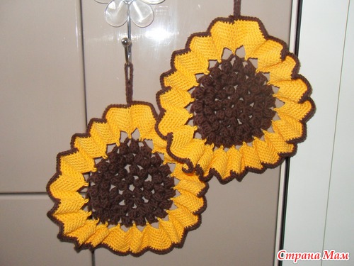 Ну и напоследок просто похвастаю небольшими подарочками, которые я сделала на 8 марта - прихватки в виде подсолнухов. Эта пара, подаренная маме, висит у нее на кухне и радует глаз (пользуется она ими нечасто, мол ей жалко испортить). Схемки подсмотрела здесь.