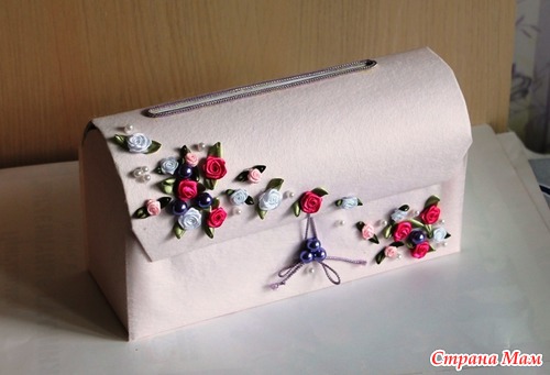 Взяла коробочку от хрензнаетчего и слепила вот такую шкатулку. Внутри она белая. Я обклеила ее бумагой. Снаружи тоже белая бумага, а сверху такая полупрозрачная розового цвета, ее используют для оформления букетов.