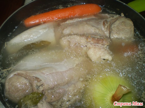 Потом добавила 1 огромную луковицу, 2 моркови, штук 10 перца горошком, 2-3 листочка лаврушки, посолила по вкусу.