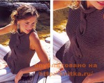 выполнить боковые швы, оставив внизу разрезы длиной 15 см. Выполнить один плечевой шов. Набрать 72 п. по вырезу горловины (30 п. по спинке и 42 п. по переду) и связать 6 см лиц. гладью, выполнить второй плечевой шов.