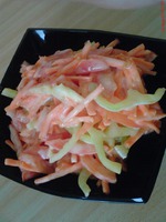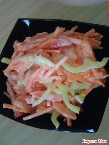 Капусту нашинковать. Помидоры разрезать на две половинки, затем тонко порезать на дольки. Морковь и перец нарезать тонкой соломкой. Посолить. Заправить майонезом.