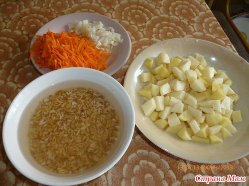 Овес промыть и замочить часа на 2. за это время натрем морковь, мелко порежем лук. и почистим и нарежем картошку.