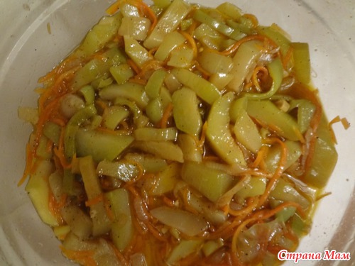 6) Соединить кабачки и поджарку. Накрыть крышкой и охладить до комнатной температуры время от времени перемешивая. Затем убрать в холодильник на 12 часов.