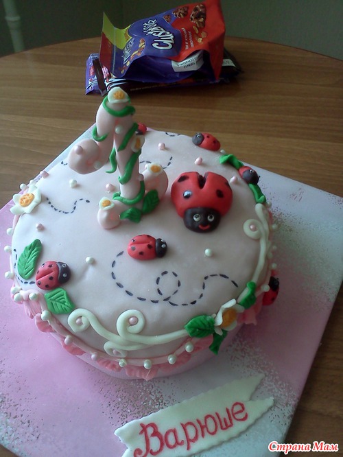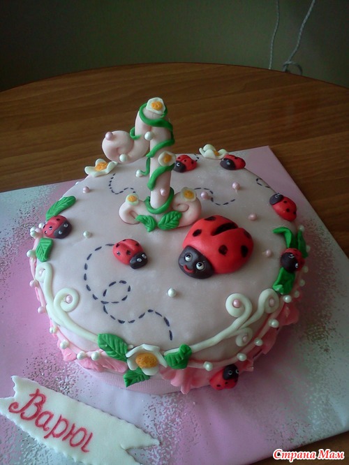 Здравствуйте всем! Вот такой торт получился для дочери подруги на 1 год! Внутри, как всегда, молочная девочка со сметанно-творожным кремом и вареной сгущенкой, грецкие орехи и чернослив, пропитка Чудо-молоко ванильное. Жалко проволоки не было, так усики для божьей коровки напрашиваются.