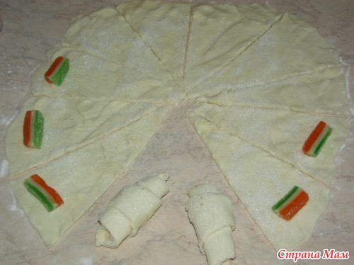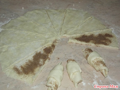 Разрезать круг на сегменты, можно скрутить и так, но я добавляю начинку, корицу или мармелад. Каждый сегмент скручиваем от внешнего края к центру. Оставшуюся часть теста также раскатать и скрутить.