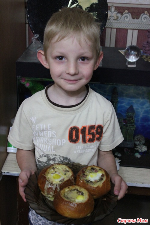 Сегодня я сделала начинку- грибы шампиньоны+лук (предварительно пассировала), ветчина, сыр на тёрке натёрла, в булки, сверху перепелиное яйцо. Еле-еле осилила одну булочку.