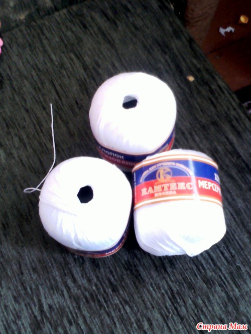. Ему досталось:три моточка белого хлопка фирмы "камтекс"