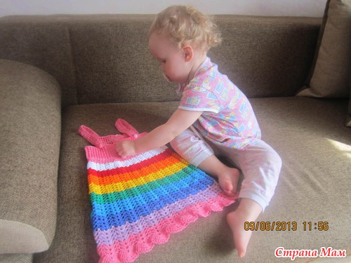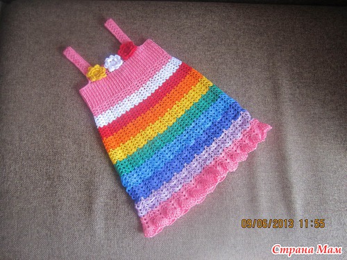 Привет, наконец то связала дочке такой радужный сарафан, давно хотела, но не было всех цветов, надо было идти в магазин