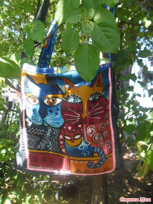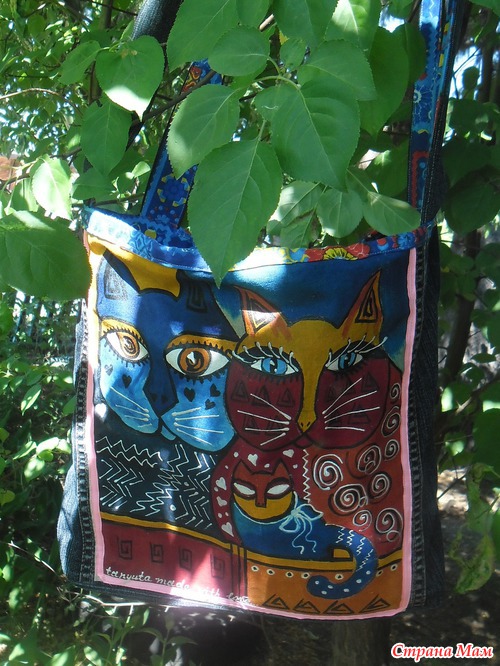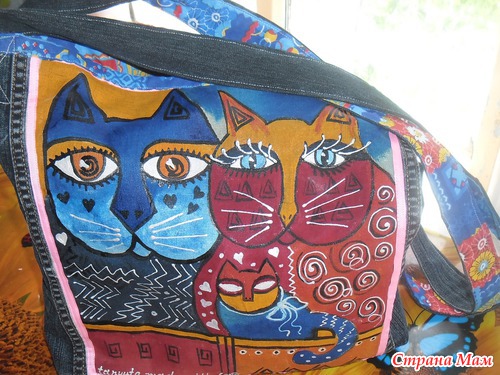 Основой для сумки послужили две джинсовки, подклад и оборотная сторона ручек- бязь, кошки нарисованы акриловыми красками по ткани.