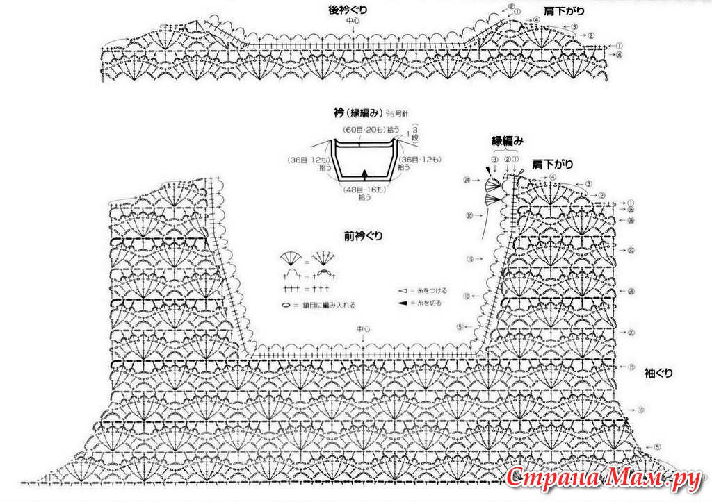 . Соединила тамбурным швом внахлест(захотелось не прятать шов, а наоборот подчеркнуть его) Перешла на крючок. Перебрав несколько узоров, остановилась на веерочках( сделала пересчет горловины и проймы под свою модель):- Поделиться