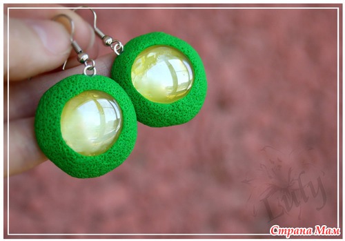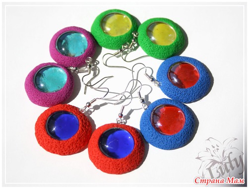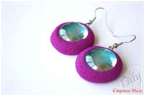 Серьги сделаны из полимерной глины и стекла-марблс. Пористая часть на покрыта лаком, обратная сторона - отпечаток с письменами, залакирована.