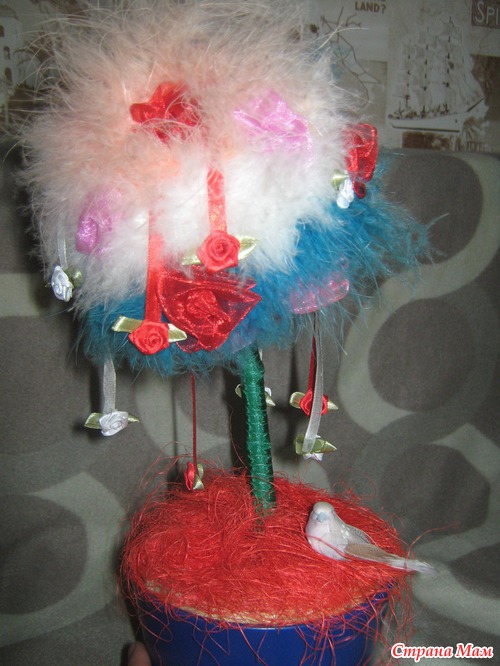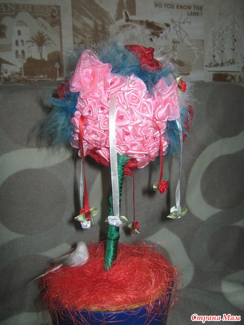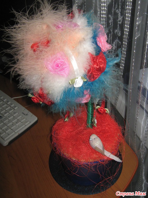 Девочки, всем привет! Получила я сегодня посылку от Наташи (Аташа мама) за норку хомяка, которую организовывала Марина. Пусть лучше поздно, но зато она у меня, а выбирала я у нее топиарий из атласных лент, не буду вас томить, показываю сие чудо