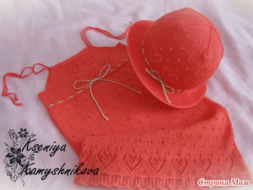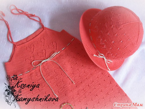 Для своей любимой принцессы связала ко дню Рождения такой симпатичный комплект. Схемки брала от этого платья- http://www.oldri.ru/page/plate-s-serdechkami, только расчеты другие, под свои нитки-это Vita coco, круговые спицы № 2. Шляпка связана снизу вверх спицами № 2, поля связаны крючком № 1 и 1,5. Больше можно посмотреть в моем альбоме, там и покрупней -https://www.stranamam.ru/album/5800117/.