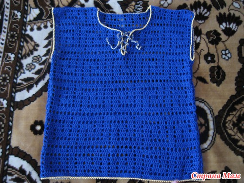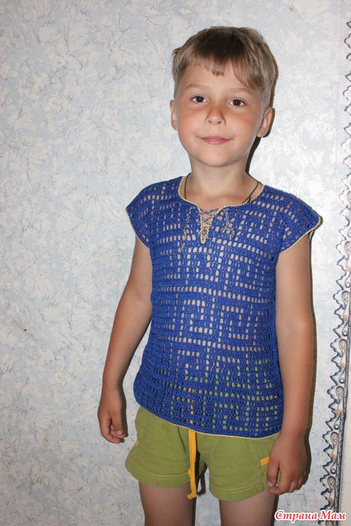 Имея в остатках немного пряжи, решила связать в подарок племяннику летнюю безрукавку. Использовала пряжу Вега, крючок №2, расход около 125г, обвязка ЯрнАрт Виолет (рачий шаг).