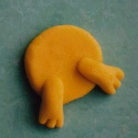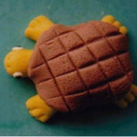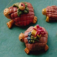 Делаем панцирь. Раскатываем коричневое тесто скалкой до толщины 0,7 см. Ножом или стекой (интервал 1 см) наносим рельефные параллельные линии, сначала горизонтальные, затем - вертикальные. Готовый панцирь приклеиваем на черепашку. Острой палочкой или зубочисткой делаем отверстие для носа и рта.