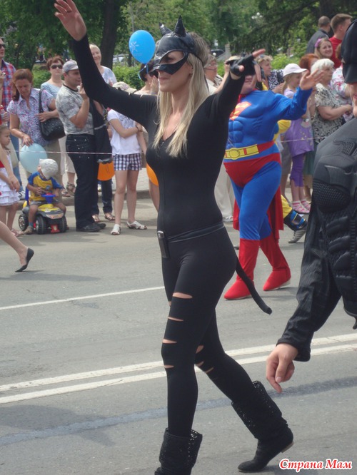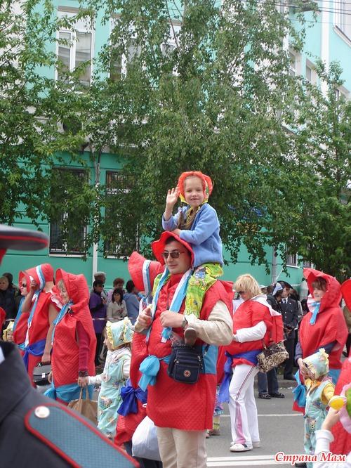 На день города танцевальный ансамбль, куда ходит моя дочь (тогда ей было еще 7 лет), традиционно принимает участие в этом костюмированном шествии. Однажды и мы попали в его ряды. Наша группа, по замыслу организаторов, должна была изображать прирост населения – т. е. новых жителей города, младенцев. Для этого участников наряжали в малышовые «конверты на выписку», чепчики, снабжали бутылками и сосками. Накануне парада выяснилось, что я в этот праздничный воскресный день работаю, но дочь уже настроилась и пришлось всю эту костюмированную красоту на себя напяливать нашему папе. А он парень не хилый, поэтому смотреть на это было весело.